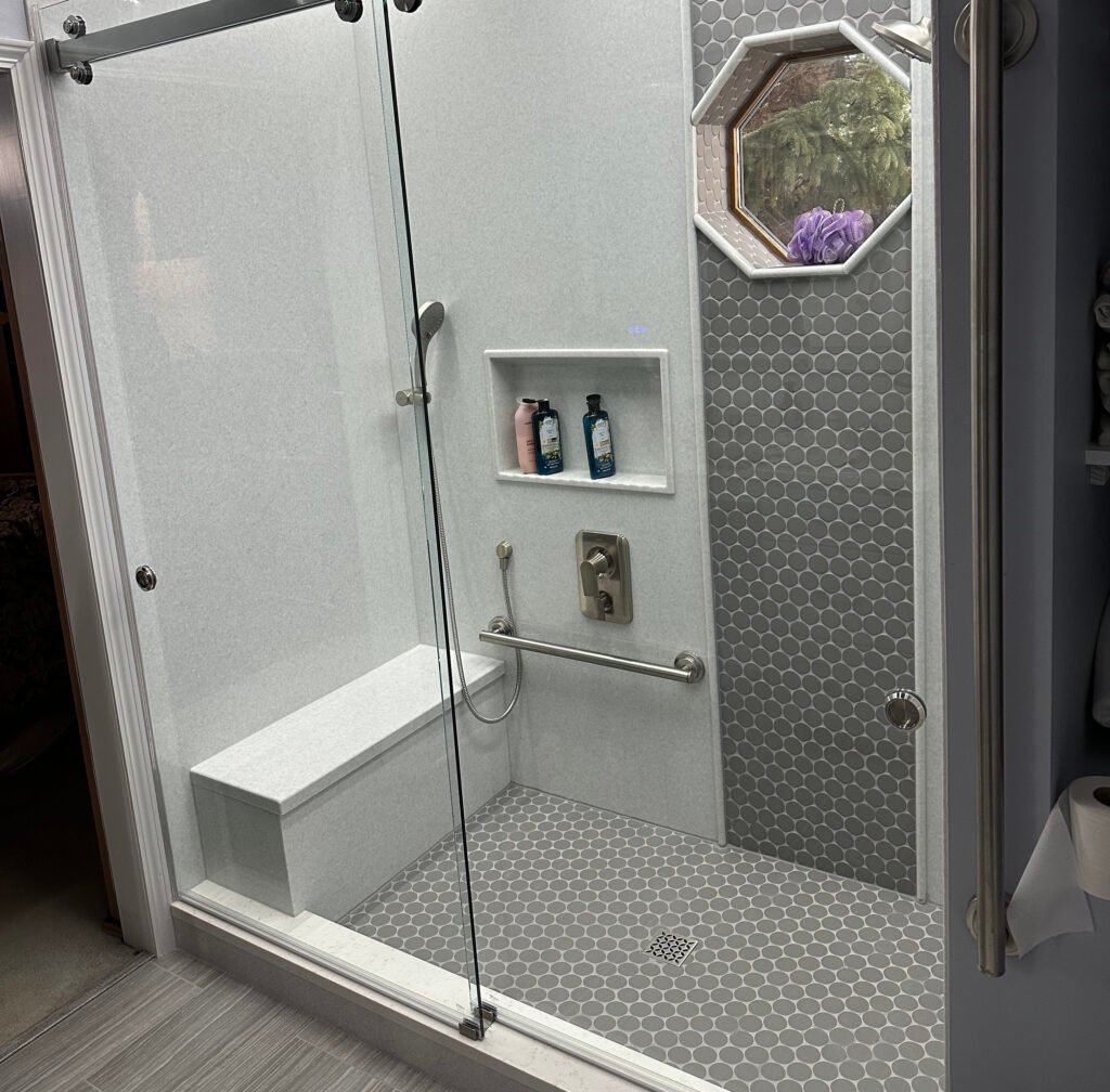 Barrier-free showers, aging-in-place upgrades, and safety-conscious bathroom conversions designed for both compliance and visual cohesion.